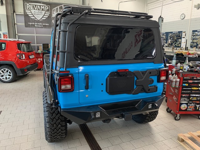 Der hintere Rahmen besteht aus starkem 2" x .120 Wandstahlrohr und wird direkt am Rahmen befestigt und bietet gleichzeitig Schutz für die hinteren Ecken des Jeep JL Wrangler.