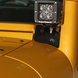 Diese speziell für den Jeep Wrangler designten Scheinwerferhalterungen werden an der Karosserie direkt unterhalb der Windschutzscheibe angebracht und ermöglichen das Anbringen von zwei Zusatzscheinwerfern.