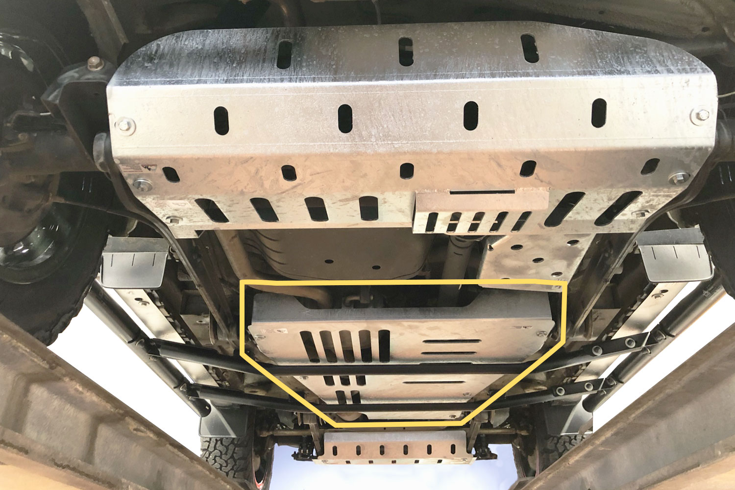 Die Getriebeschutzplatte schützt das Schalt- und Verteilergetriebe des Fahrzeugs vor einer Beschädigung bei Bodenkontakt. Sie ist passgenau und aus 4mm verzinktem Stahl gefertigt.