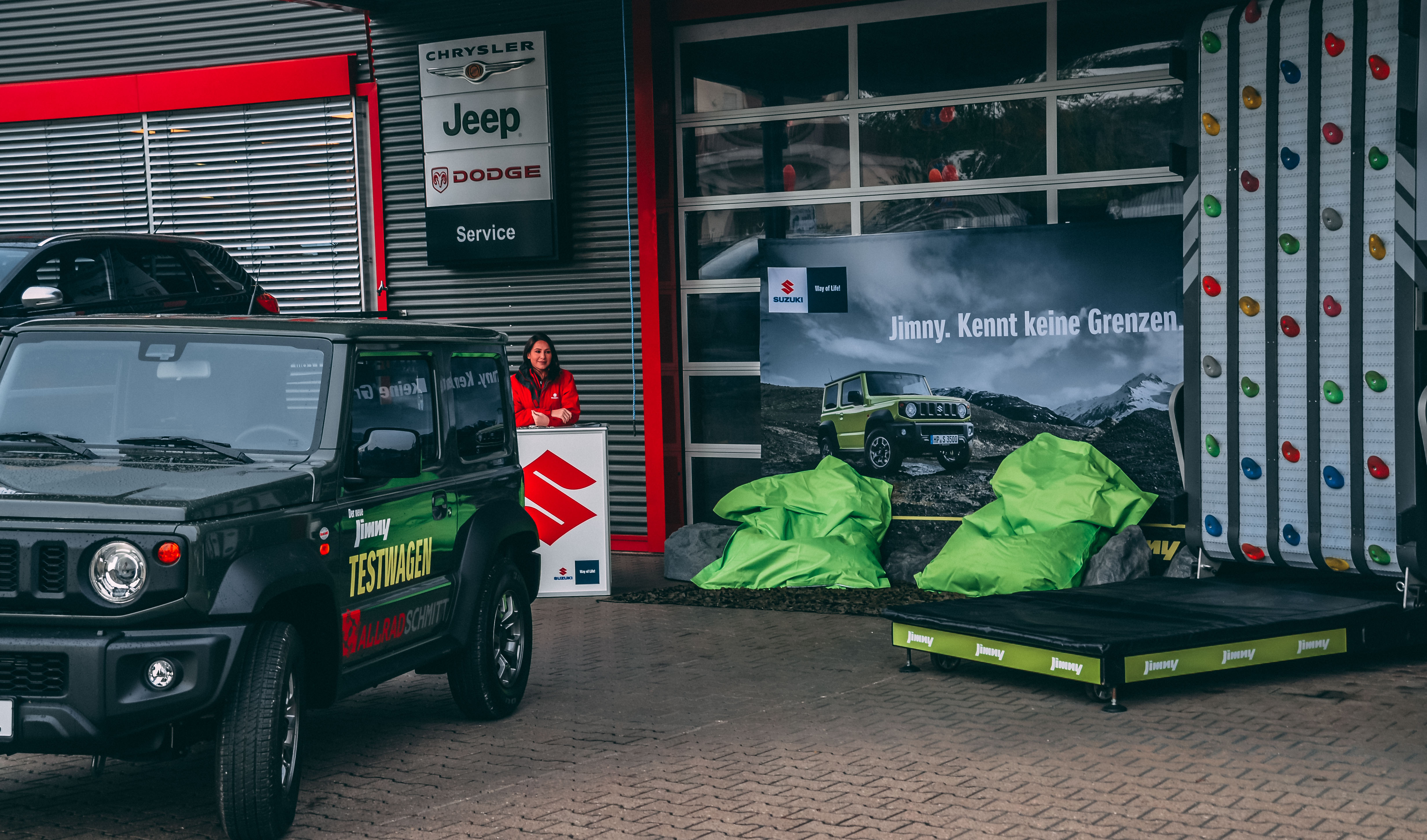 Beim Suzuki Oktoberfest konnten unsere Besucher bereits jetzt auf Tuchfühlung mit dem neuen Modell gehen. Unsere Offroad-Experten standen dabei beratend zur Seite, um die Features des kleinen Kraftpaketes näher zu bringen. Wer sich daraufhin selbst vom Jimny überzeugen wollte, konnte dies bei einer Probefahrt tun. Besonders mutige wagten sich in den mobilen Offroad Parcours und erlebten dort die Geländetauglichkeit des Fahrzeugs am eigenen Leib. Fast spielerisch erklomm der neue Jimny den Anstieg des Parcours und konnte anschließend auch bei der Abfahrt überzeugen. Dort zeigte beispielsweise die neue Bergabfahrhilfe, dass man mit dem neuen Jimny Hindernisse nicht nur schnell, sondern auch sicher überwinden kann. Weitere Action war an der „Endlos-Kletterwand“ geboten. Dort konnte man sich getreu dem Motto „Der Jimny kennt keine Grenzen“ auf eine lange Klettertour begeben konnte.